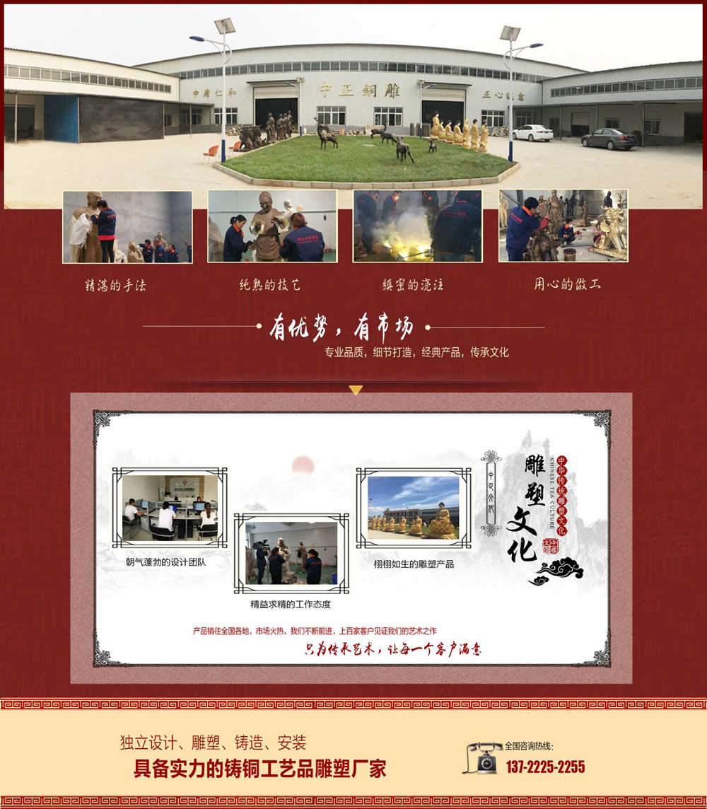 唐縣中正鑄銅雕塑制作生產(chǎn)廠家是一家具有獨立設(shè)計、雕塑、鑄造、制作施工能力的單位。擁有完善的,大型的,先進的生產(chǎn)設(shè)備,并由多位經(jīng)驗豐富的高級鑄造技師指導(dǎo)生產(chǎn)及制作。公司主要鑄造人物雕塑、動物銅雕、城市雕塑、銅佛像、銅獅子、鑄銅鼎、銅鐘等銅工藝品,可按客戶提供銅雕圖片訂做加工,銅雕塑做工精美,質(zhì)量有保證。